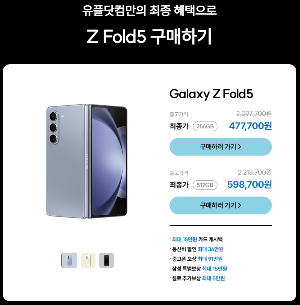 Z Fold5는 유플닷컴에서 26만원 가량 할인이 가장 좋은 혜택입니다. 단, 가장 비싼 요금제를 사용하셔야 합니다.