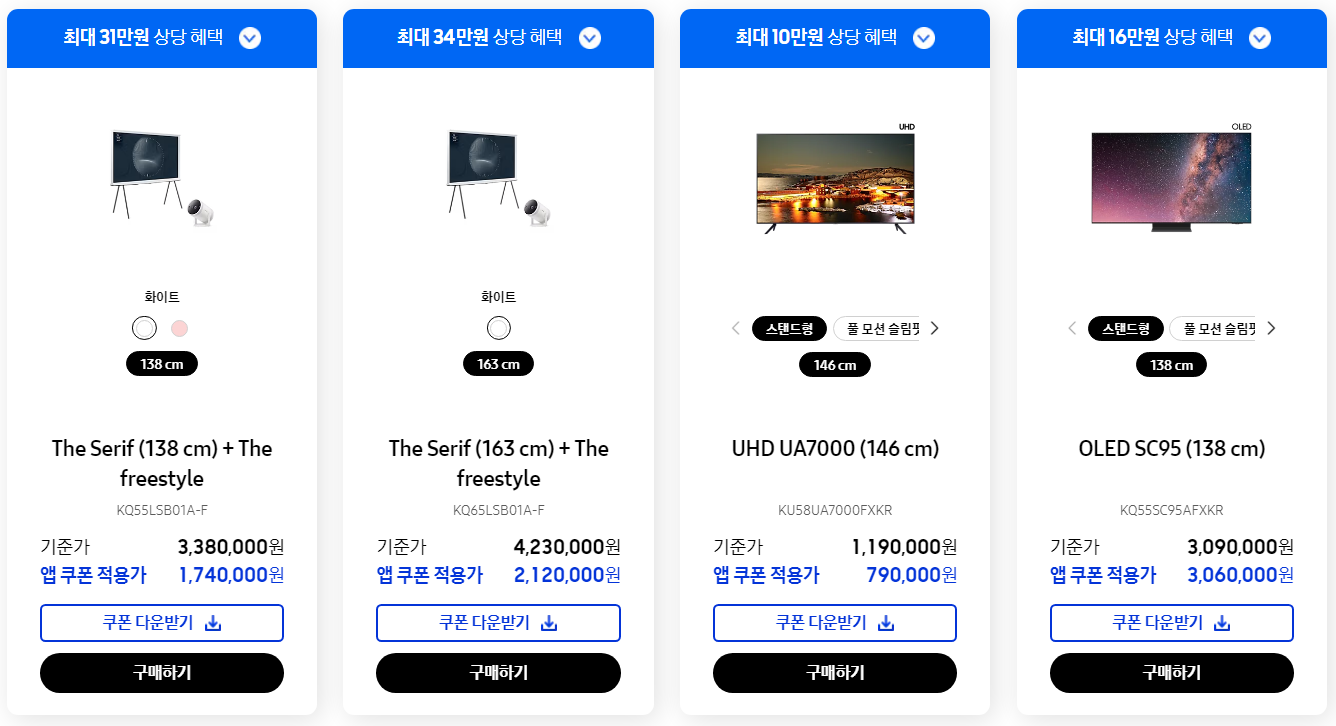 삼성닷컴 앱에서 구매하시고 애 쿠폰으로 최대 15만 원까지 추가 할인받으세요. 삼성닷컴 앱은 안드로이드 기종은 갤럭시 스토어와 구글 플레이스토어에서 다운로드 가능합니다.