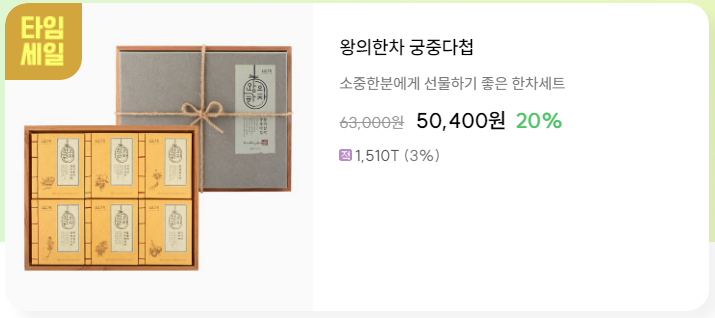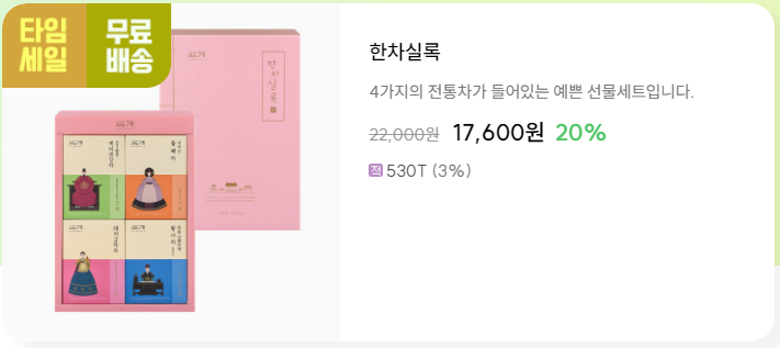 과일 허그 티캔 양갱 다식세트는 건조 과일 칩과 블렌딩티 그리고 달콤한 양갱을 함께 담았습니다. 왕의한차 궁중다첩은 소준한 분에게 선물하기 좋은 한차세트입니다. 한차실록은 4가지의 전통차가 들어있는 예쁜 선물세트입니다. 이렇게 다양한 쌍계명차 선물세트가 준비되어 있습니다. 타임 세일로 하루동안 시간 한정으로 20% 세일을 하고 있으니 좋은 선물 좋은 가격에 마련하시기 바랍니다.