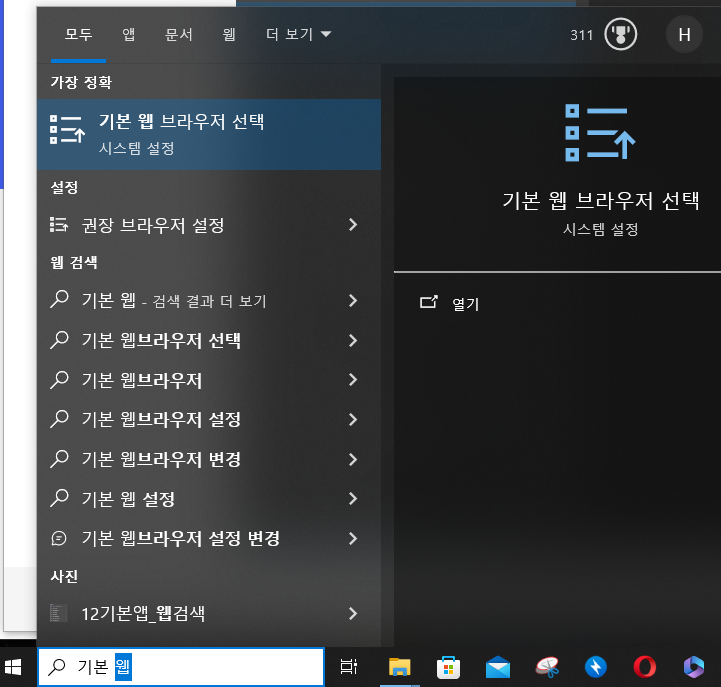 1. 시작 버튼 옆 '찾기'에 기본 웹이라고 씁니다.