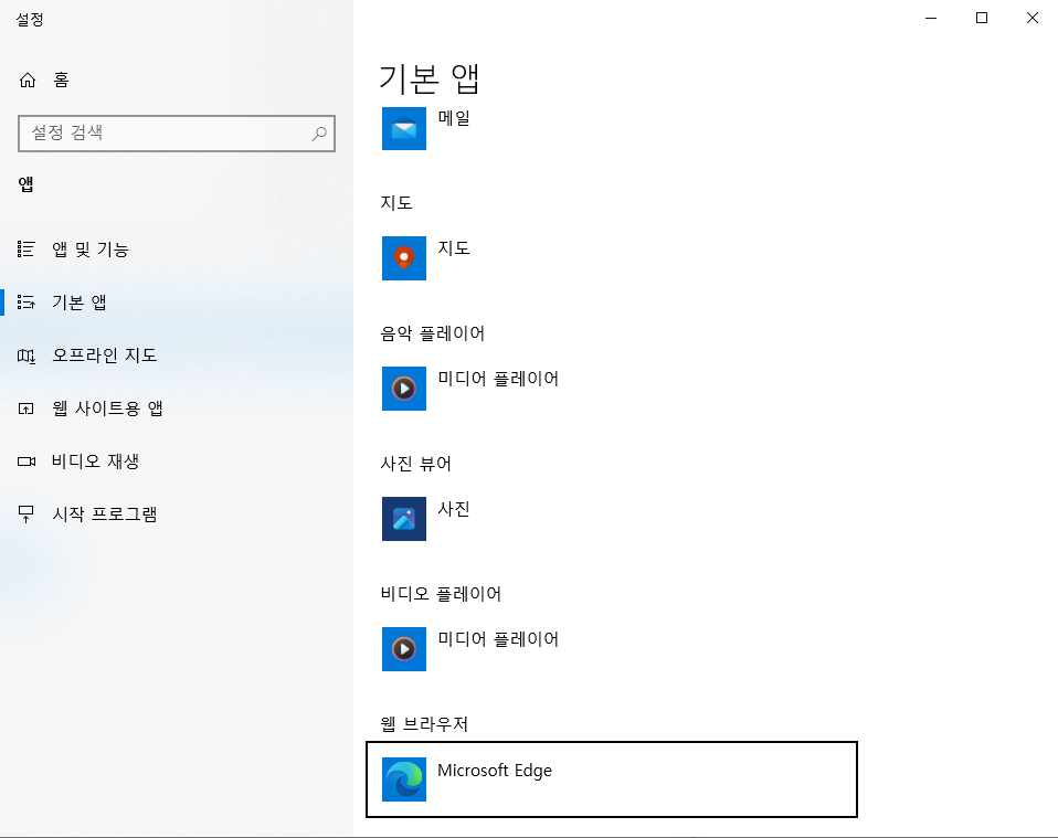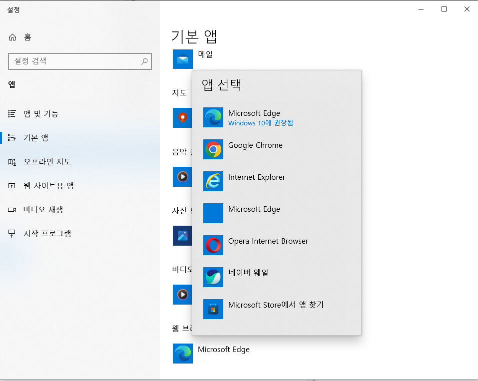 사진의 앱 선택 목록은 여러분의 화면과는 다를 수 있습니다. 현재 여러분의 컴퓨터에 설치되어 있는 웹 브라우저들이 보이게 됩니다.