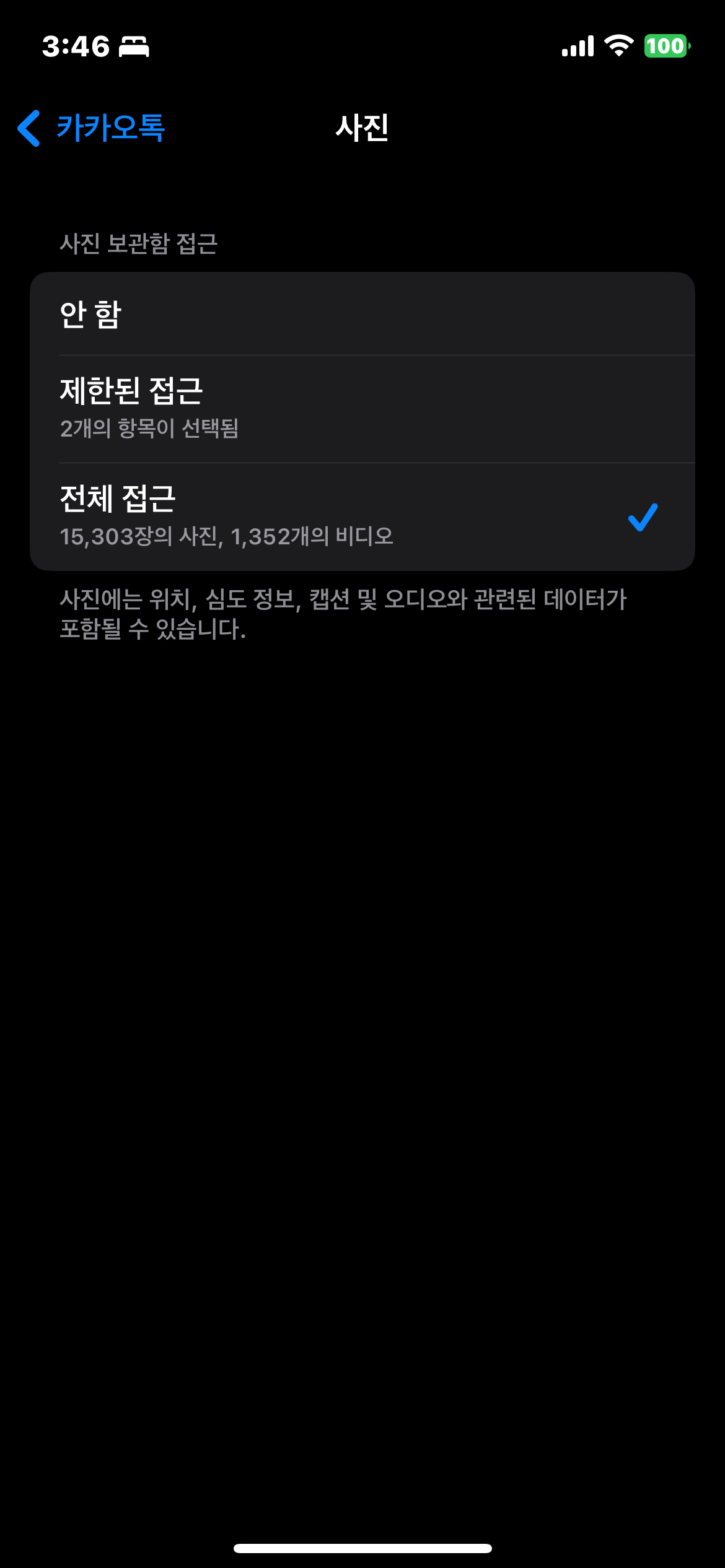 사진 접근 권한을 제한해 놓았기 때문입니다. 보통 카카오톡을 처음 설치, 재설치를 하거나 업데이트를 할 경우 카카오톡 앱이 나의 사진에 접근할 수 있는 권한을 제한해 놓아서 사진이 보이지 않는 것입니다.
