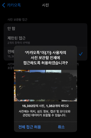 아이폰 설정으로 들어가서 카카오톡 앱의 사진앨범 접근권한을 전체허용으로 바꾸시면 됩니다.