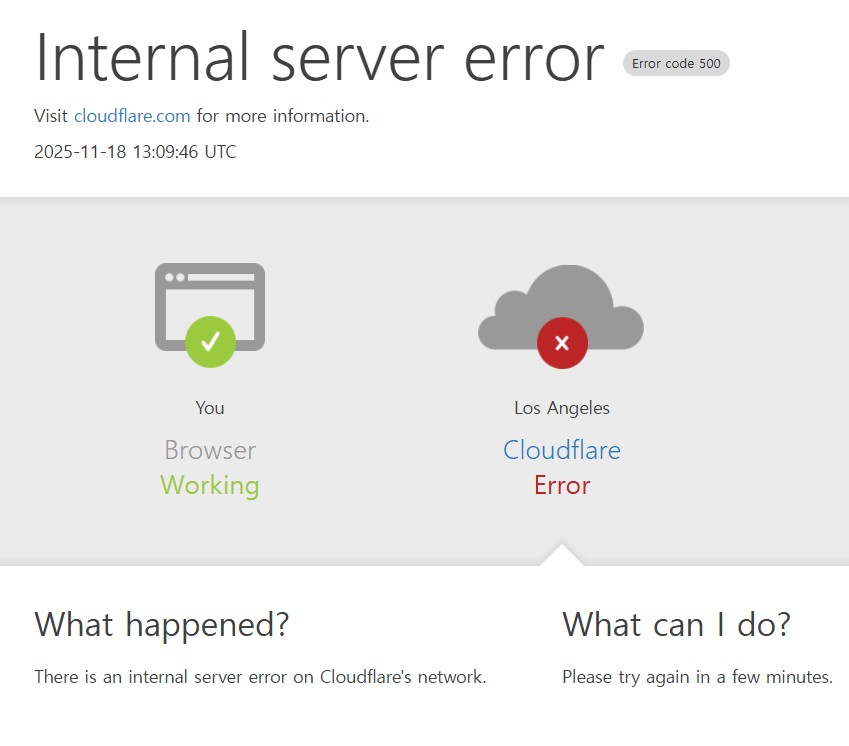 가장 흔한 케이스입니다. 클라우드플레어는 결국 뒤에 있는 원 서버(origin)에 요청을 보내서 결과를 받아와야 하는데, 원 서버에서 이런 일이 벌어지면 에러 500이 뜰 수 있습니다.