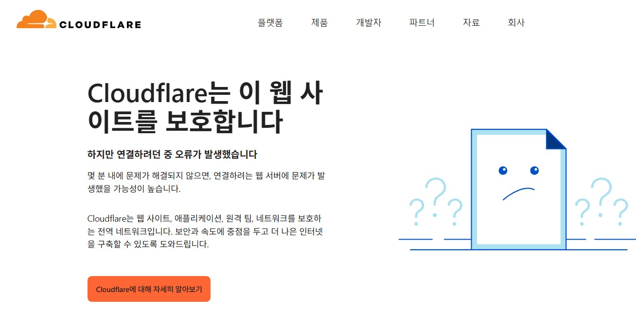 메시지만 딱 뜨면 당황스럽죠. 게다가 화면에 Cloudflare(클라우드플레어) 로고까지 보이면, “이거 클라우드플레어가 문제인가?” 싶은 생각이 들기도 합니다.