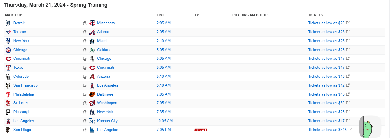 ESPN MLB 공식 홈페이지에서 경기 일정과 티켓 예매가격을 보면 315달러로 표시된 걸 보면 한국 티켓 가격은 35만 원 정도 될 것으로 예상됩니다.
